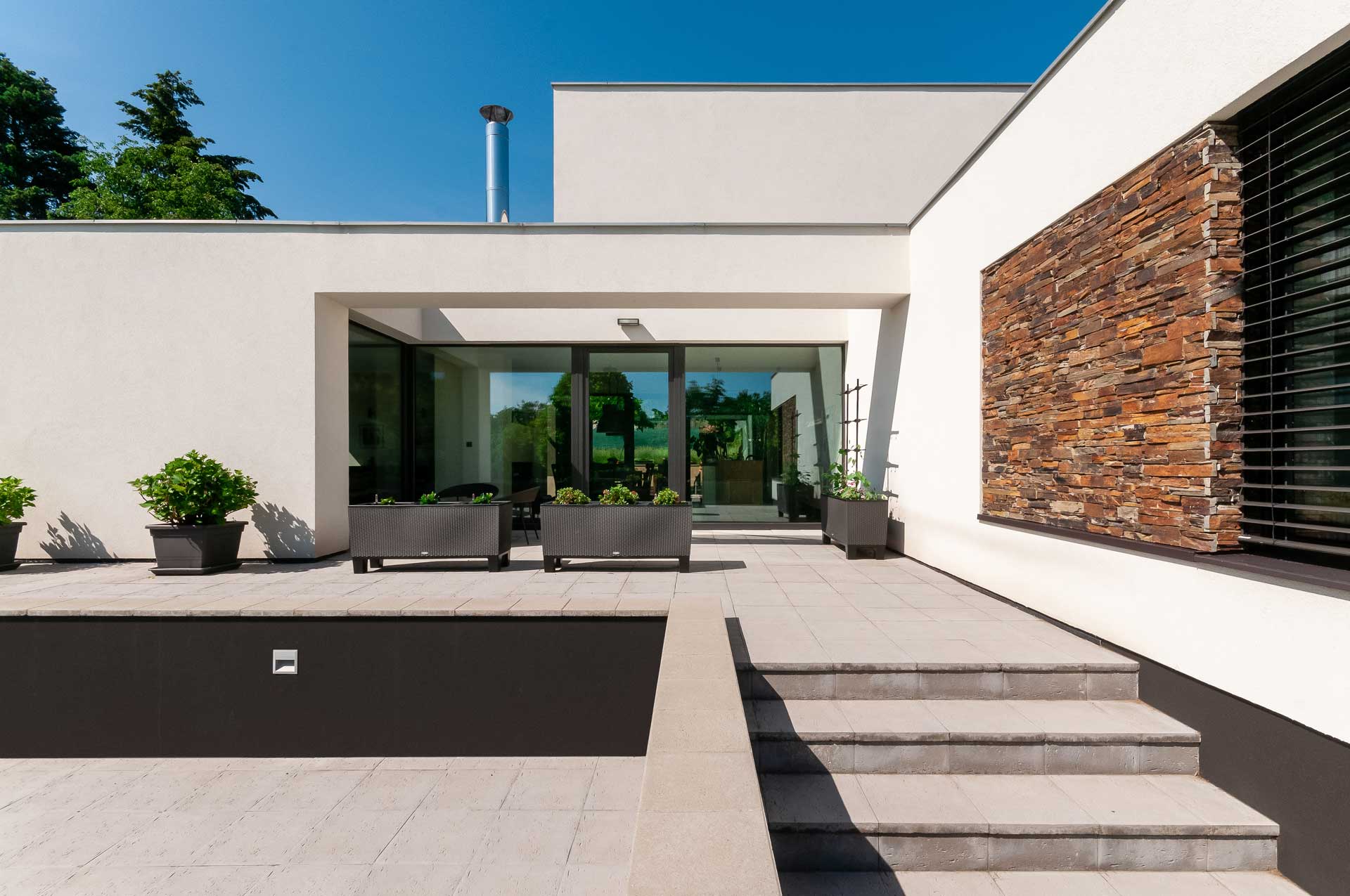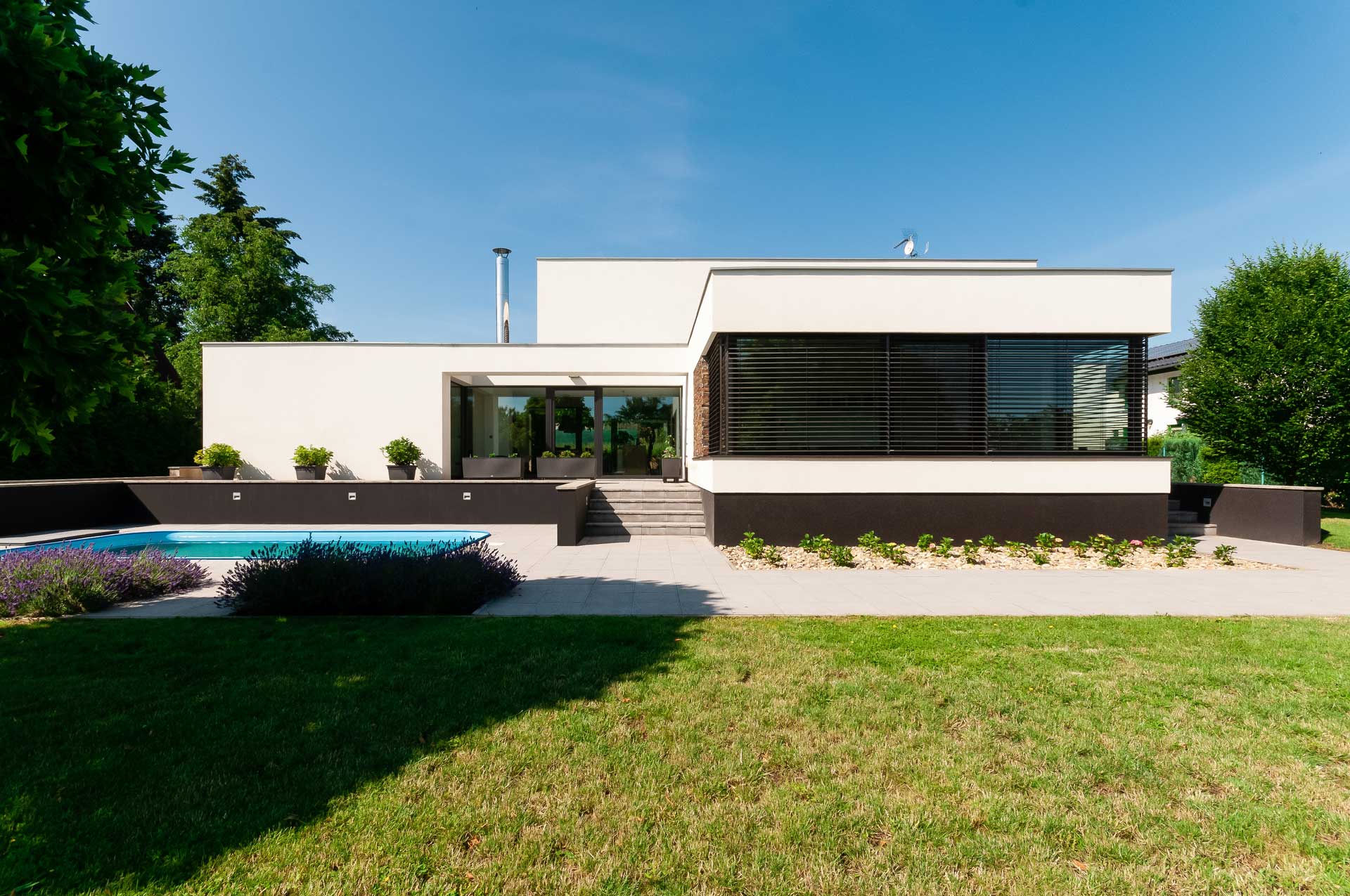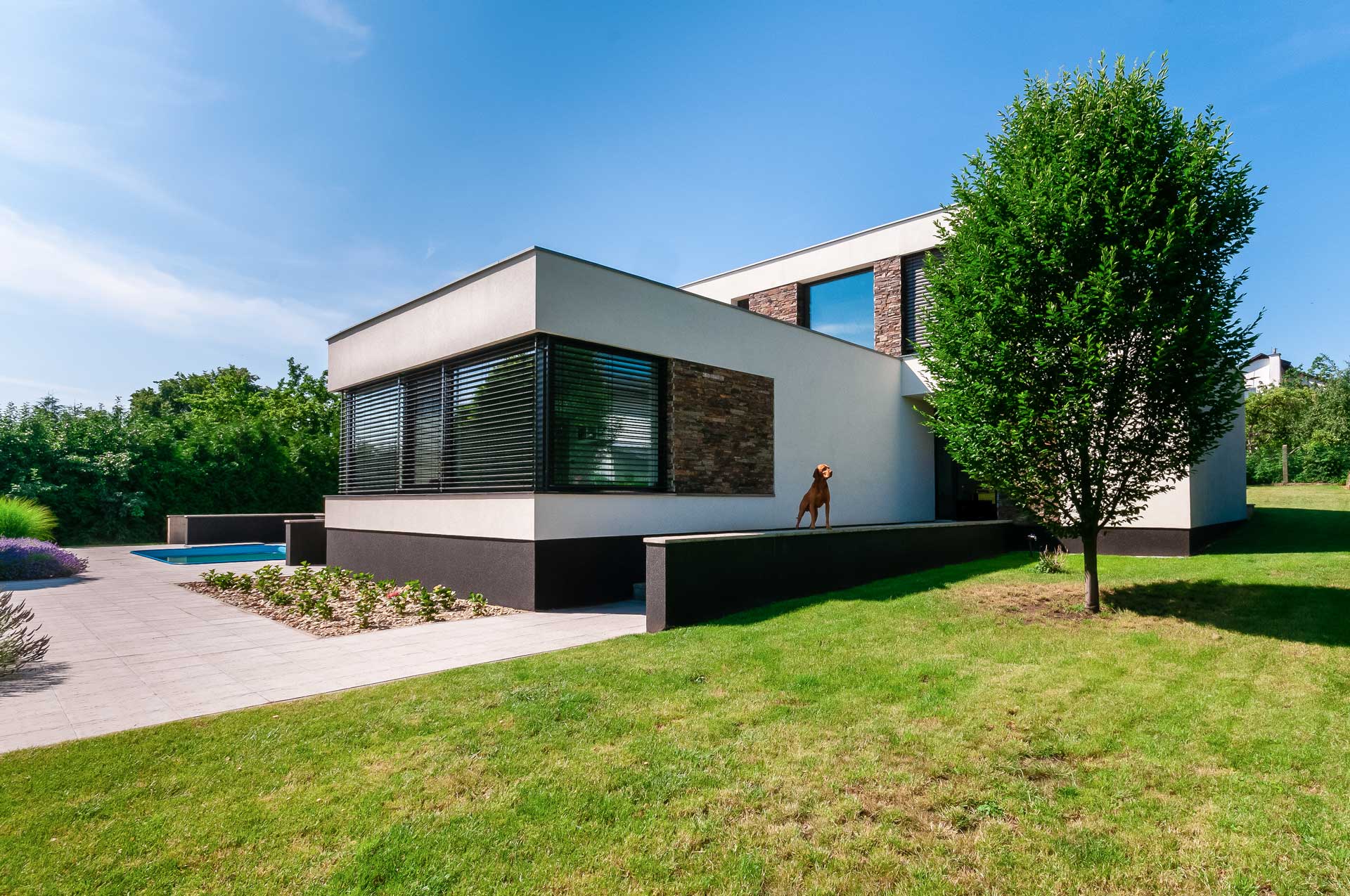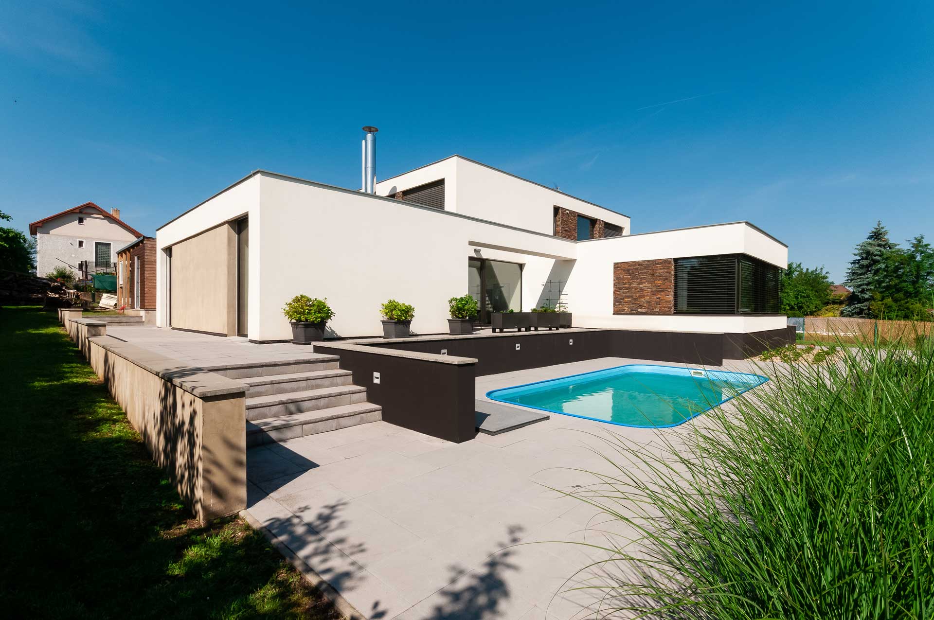 Velkorysá, moderní rodinná vila v Brandýse leží na okraji zahrádkářské kolonie, v tichu, zeleni a s výhledem na Labe. Její majitel, pan Dvořák, ji s pomocí několika zedníků stavěl vlastníma rukama. Velkoformátová okna s našimi PVC profily Eforte a veškeré vnitřní i vnější stínění jim pak instalovala jejich vlastní firma – Samat, spol. s r. o.