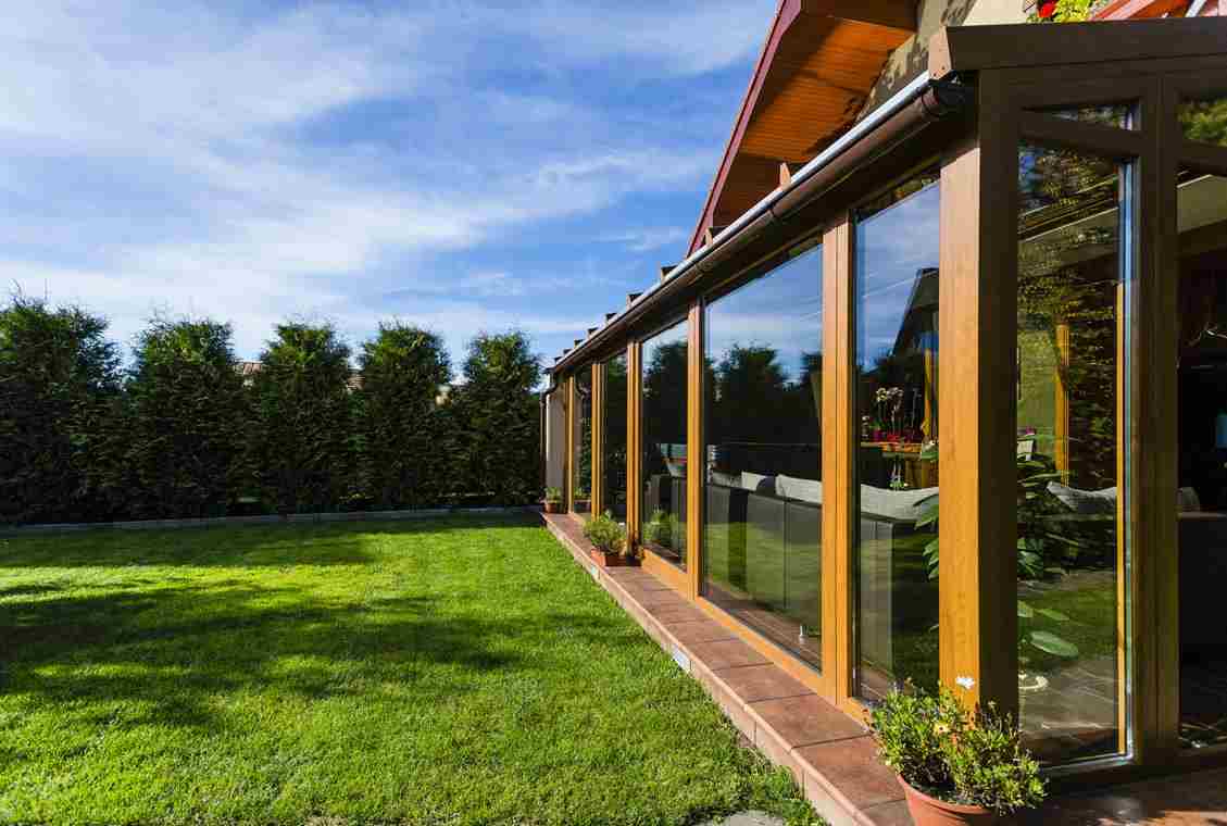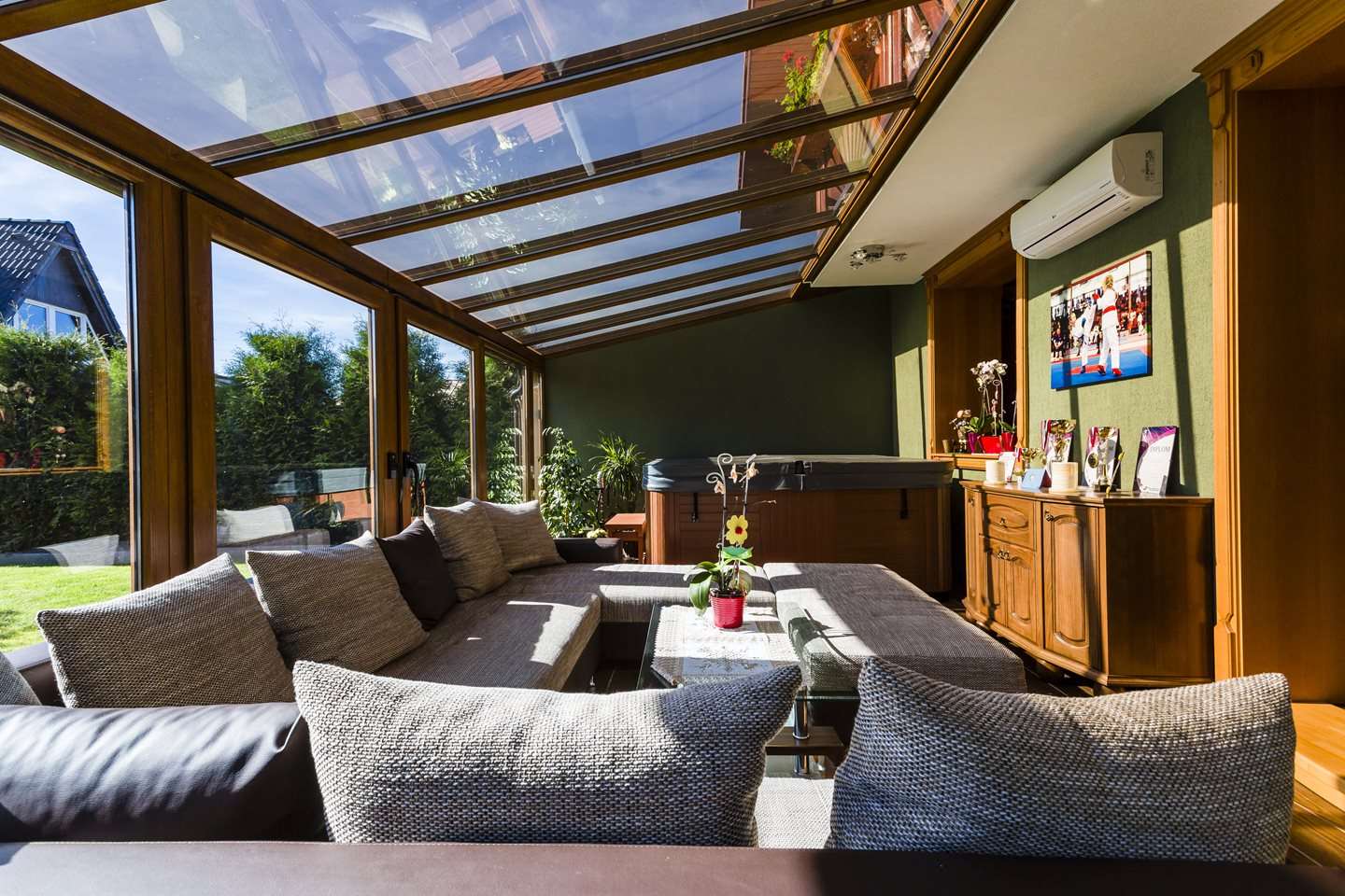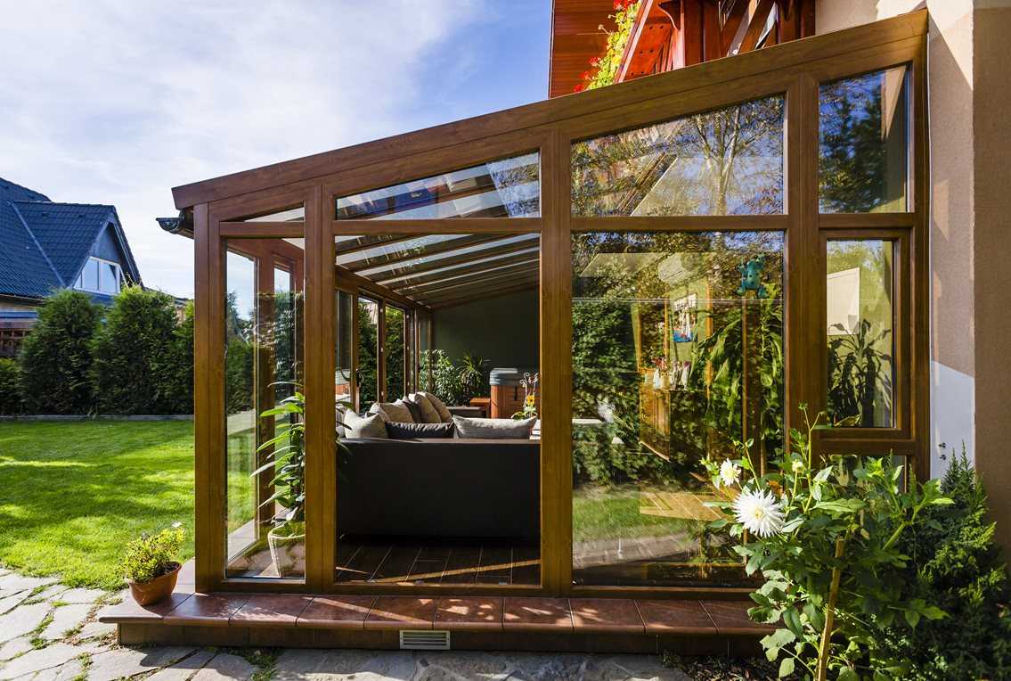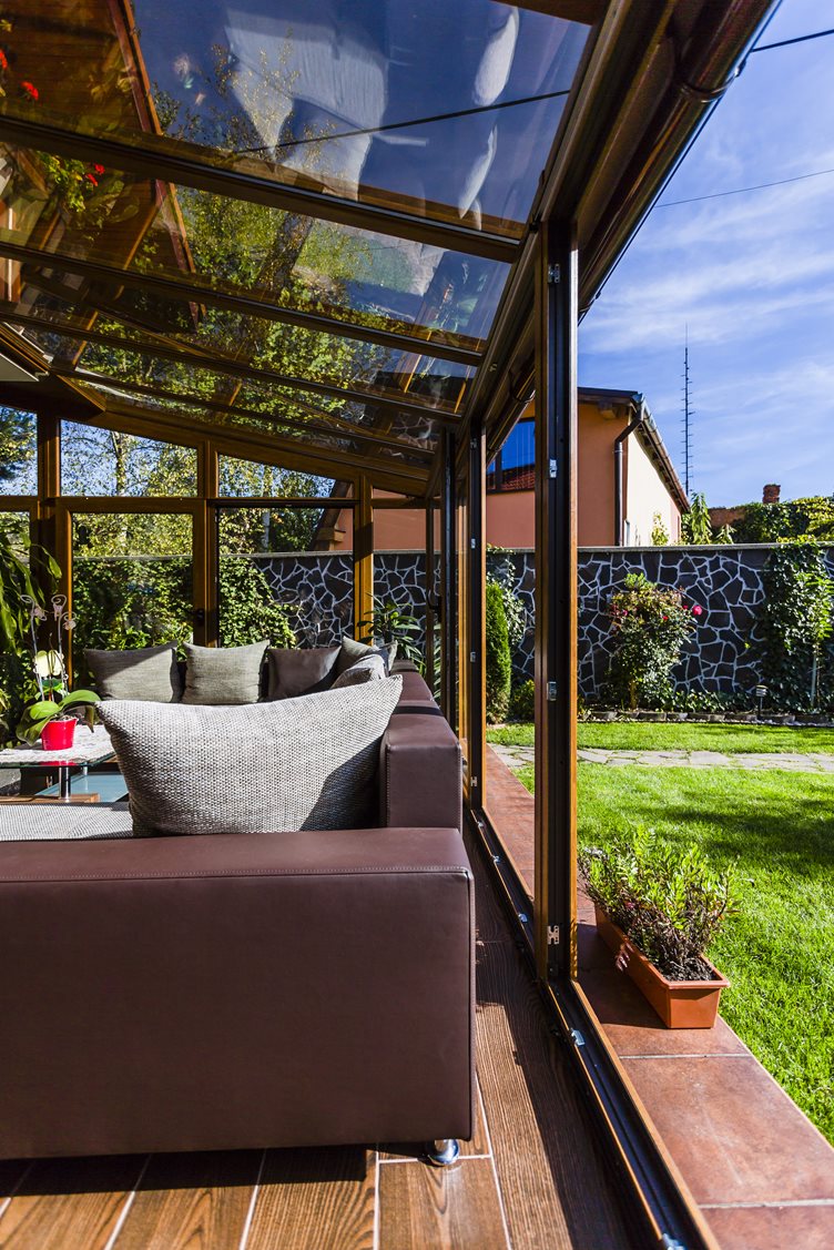 Zimní zahrada vždy vytváří harmonickou součást domu a proto je důležité sladit nejen konstrukci, ale i rámy oken a dveří s celkovým charakterem domu. Konstrukce z plastových profilů nemusí být jen v bílé barvě. V nabídce společnosti Deceuninck si můžete vybírat z bohaté nabídky folií jak v RAL barvách, tak i v různých dekorech dřeva. . V této zimní zahradě byly použity profily Arcade s povrchovou úpravou zlatý dub.