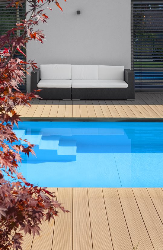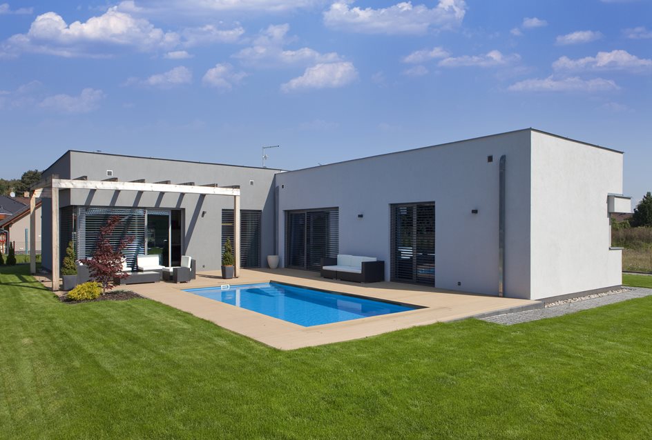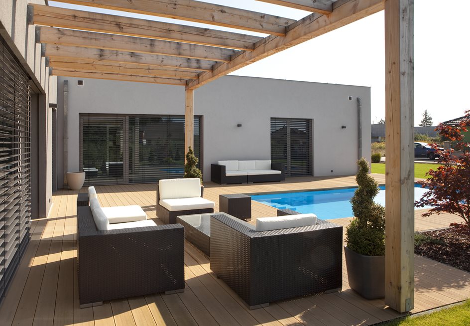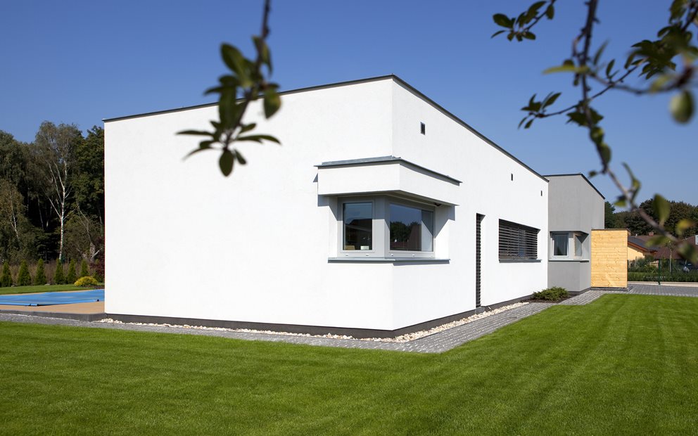 Šedý a bílý kvádr do tvaru L, atrium s terasou a bazénem, zahradní domek s letní jídelnou a venkovním krbem. Vše, co rodina s malými dětmi potřebuje. Na zahradě si zvláštní pozornost zaslouží moderní kompozitní materiál Twinson, použitý na terasu a lemování bazénu. Je velmi stabilní, vhodný i pro stálý kontakt s vodou z bazénu. Příjemně se po něm chodí, protože se nikdy nerozpálí sluníčkem. A když se prkna umastí třeba od jídla nebo opalovacího krému, stačí ho ostříkat vodou.
